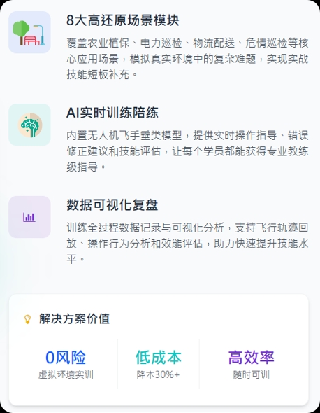 融合AI与XR技术,打造高还原虚拟仿真训练环境,解决传统无人机培训高风险、高成本、低效率难题,助力专业飞手规模化培养